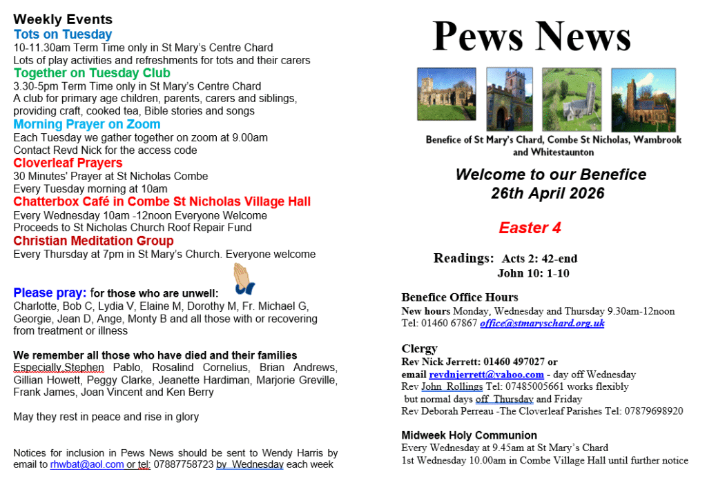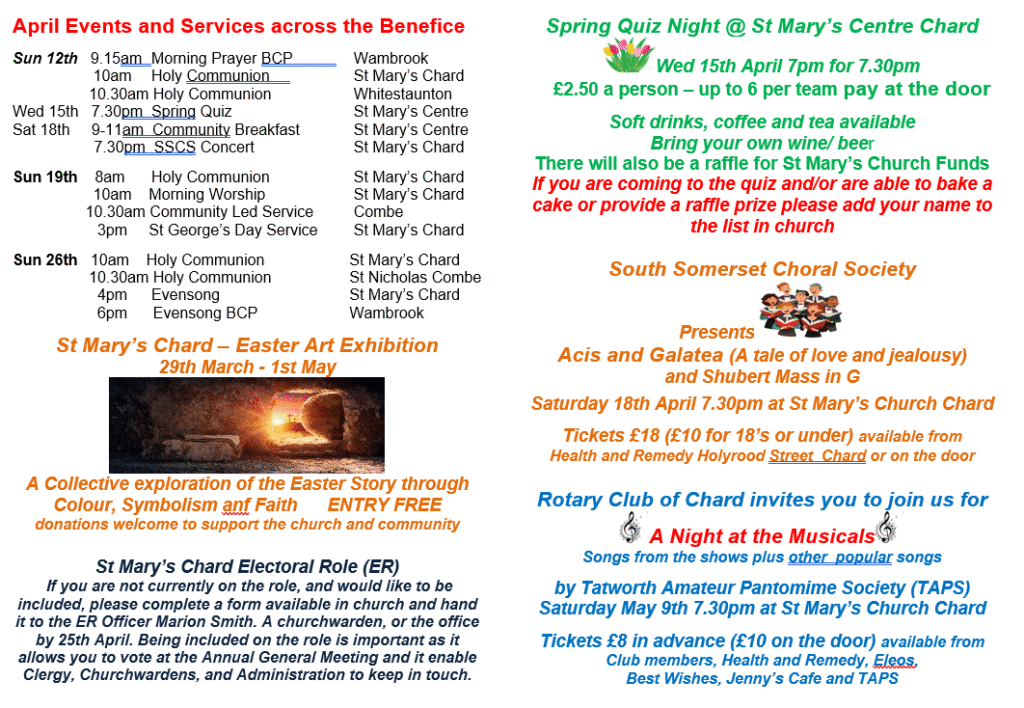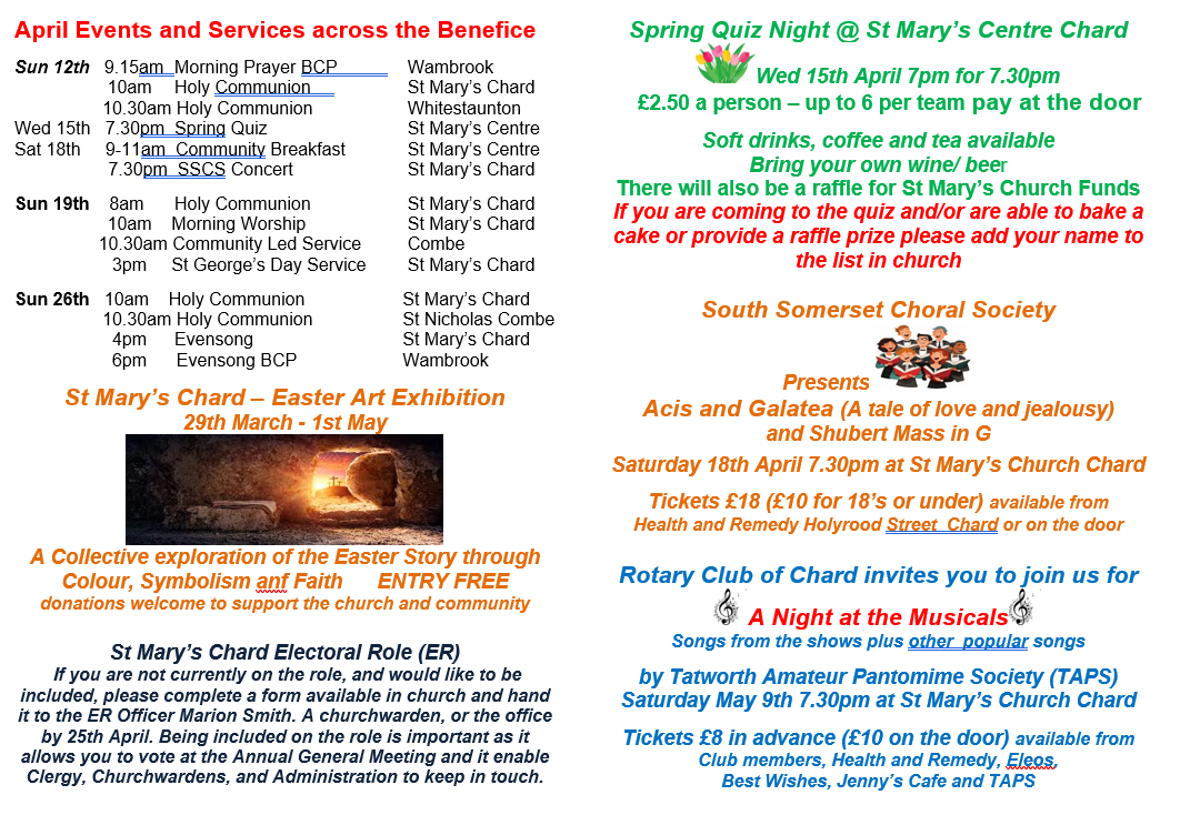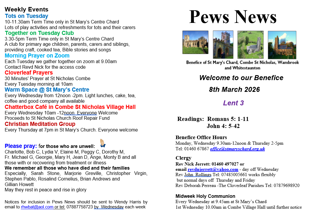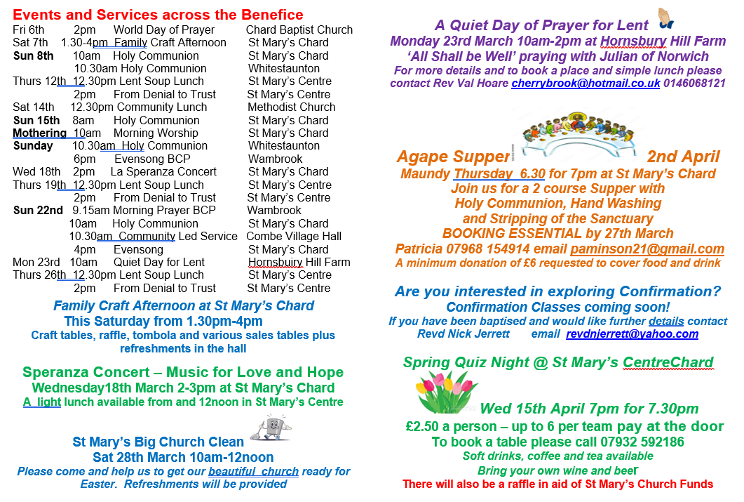 Please make a note of the World Day of Prayer – prepared by the women of Nigeria – Friday 6th March 2pm at Chard Baptist Church.