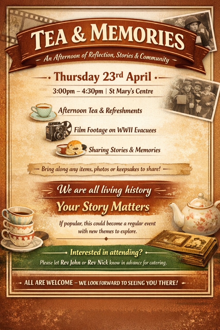 We had a discussion about changing the meeting day so that they could take place at St. Mary’s Centre. We have settled on the third Thursday of the month starting on 21st May. This is to avoid a clash with the Lent group and other prebooked activities happening in the centre. The March meeting will be in the church on Tuesday 3rd March and the April meeting will be in the centre on Thursday 9th April. All are welcome to come and see. We start at 2.30pm.